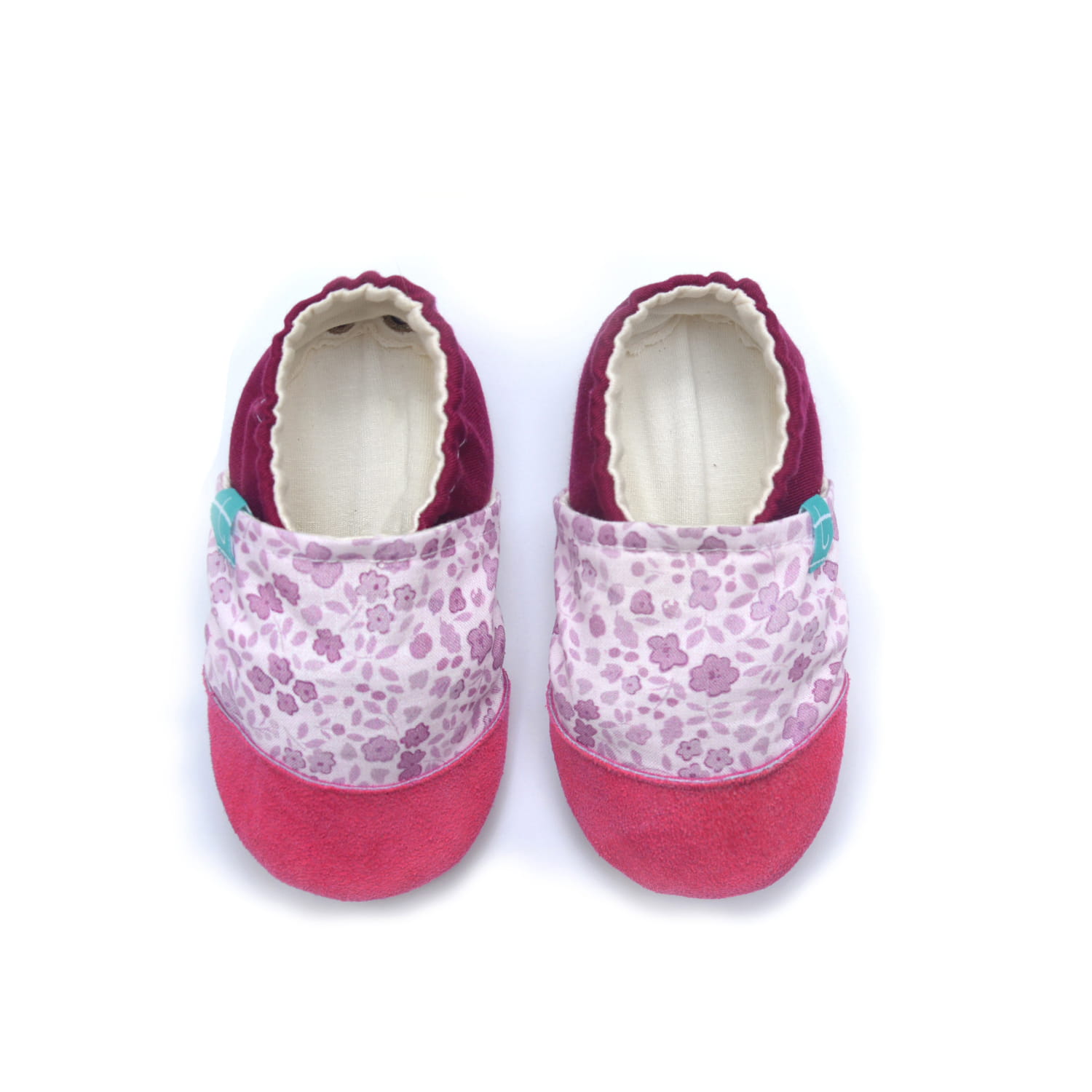 Wyjątkowym akcentem kolorystycznym, który dodaje energii i charakteru, jest intensywny kolor fuksji zdobiący nosek kapci. Ten żywy odcień kontrastuje z subtelnym kwiatowym wzorem, przyciągając wzrok i dodając nowoczesności. Z kolei elegancka piętka w głębokim odcieniu burgundu nadaje kapciom wyrafinowanego wyglądu i zapewnia dodatkowe wsparcie dla małej stopy.