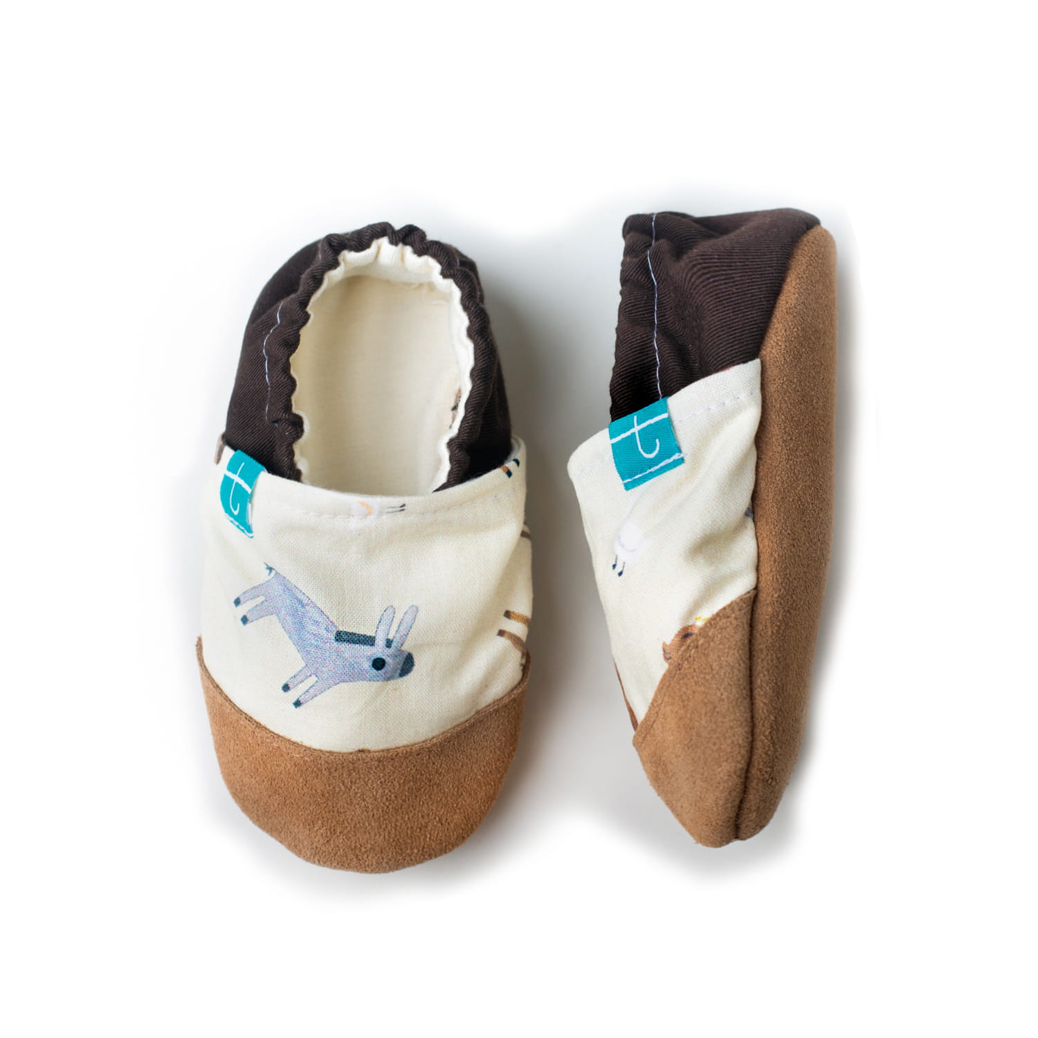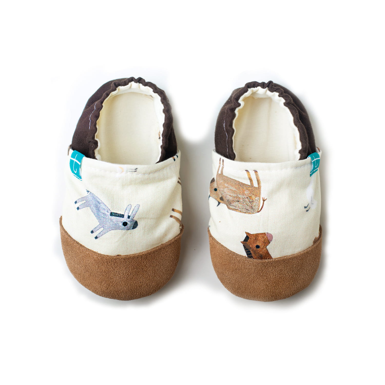 Kapcie do żłobka TITOT zwierzęta na farmie na jasnym tle.